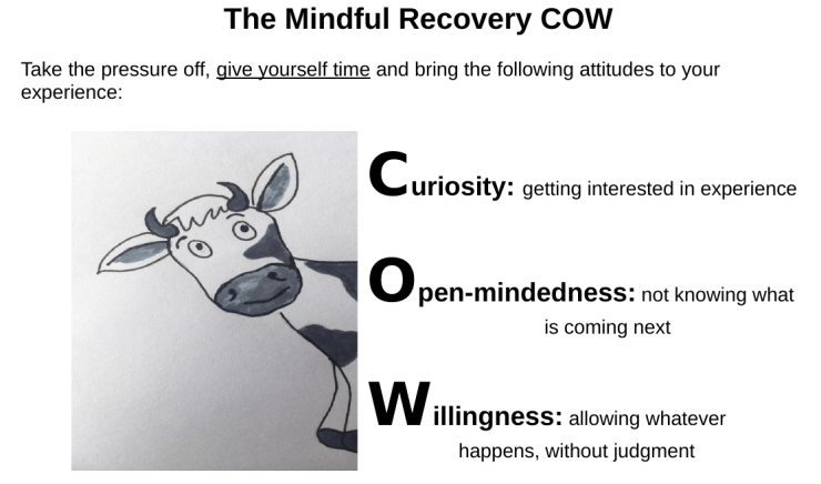 There are many definitions and ways of understanding it – the ABC (adapted from Valerie Mason-John‘s ABC) is a helpful “what” and the Mindful Recovery COW a good “how” – you could alternate these as ways of explaining (both are a little much at one time!), interspersed with peers’ explanations and some of the ideas below: